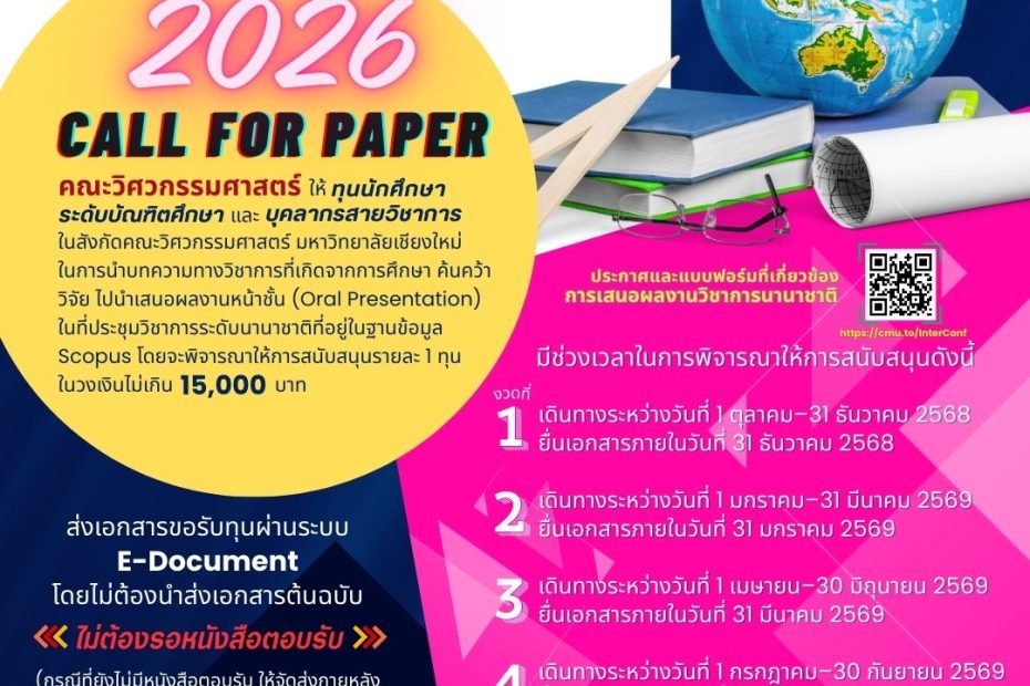 ประชาสัมพันธ์ทุนสนับสนุนเสนอผลงานวิชาการนานาชาติ ระดับบัณฑิตศึกษา และสนับสนุนการเสนอผลงานวิชาการนานาชาติ สำหรับบุคลากรสายวิชาการ ประจำปีงบประมาณ 2569 มีช่วงการเดินทาง กำหนดยื่นเอกสารขอรับทุน ดังนี้งวดที่ 1 ระหว่างวันที่ 1 ตุลาคม – 31 ธันวาคม 2568 ภายในวันที่ 31 ธันวาคม 2568งวดที่ 2 ระหว่างวันที่ 1 มกราคม – 31 มีนาคม 2569 ภายในวันที่ 31 มกราคม 2569งวดที่ 3 ระหว่างวันที่ 1 เมษายน – 30 มิถุนายน 2569 ภายในวันที่ 31 มีนาคม 2569งวดที่ 4 ระหว่างวันที่ 1 กรกฎาคม… Read More »การสนับสนุนทุนเสนอผลงานวิชาการนานาชาติ ประจำปีงบประมาณ 2569